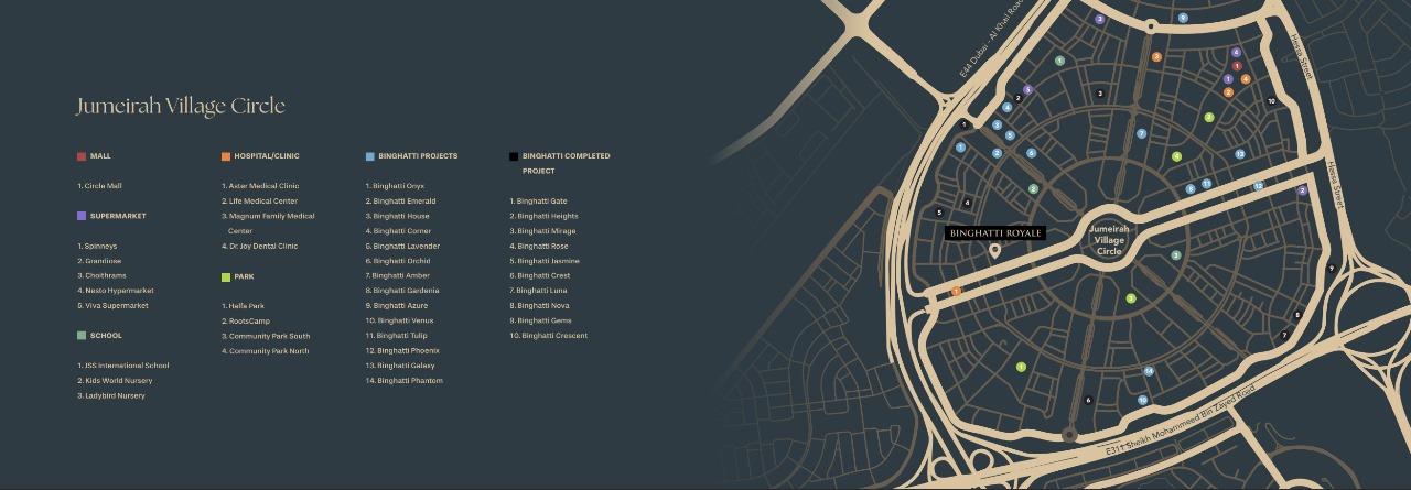 Binghatti Grove位于JVC,JVC社区内基础设施配套完善,占地 570 公顷,拥有 80,000 多名居民,预计在未来几年内,随着在建项目的完工,JVC 的新居民人数将激增,届时居民人数将达到约 300,000 人。