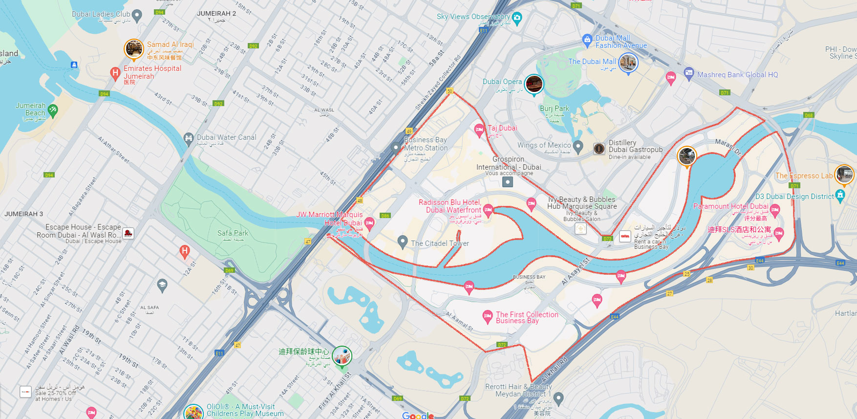 商务港地区沿迪拜运河两岸围绕迪拜市中心,区域内仅22.1% 作为住宅项目,其他皆为商业及综合运营项目,是迪拜政府全力打造的区域性国际化大型商务港湾以及中东地区商务之都,致力于成为像纽约曼哈顿及东京银座这样的城市中心。该地区聚集众多领先的国际和当地龙头企业、以及著名五星级酒店,汇聚各种娱乐设施、公园、教育机构、购物中心和餐饮场所等一流配套设施。