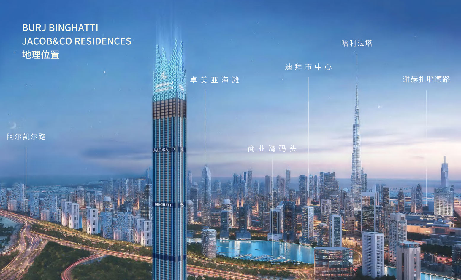 Burj Binghatti Jacob & Co Residences 坐落在迪拜商务港的黄金地段,与世界之巅哈利法塔交相辉映,共同绘就迪拜天际线的壮丽景观。此处位置的独特优势使得住户可以同时享受到壮丽的城市景观和宁静的港口景致,两者的完美融合形成了难得的视觉体验。