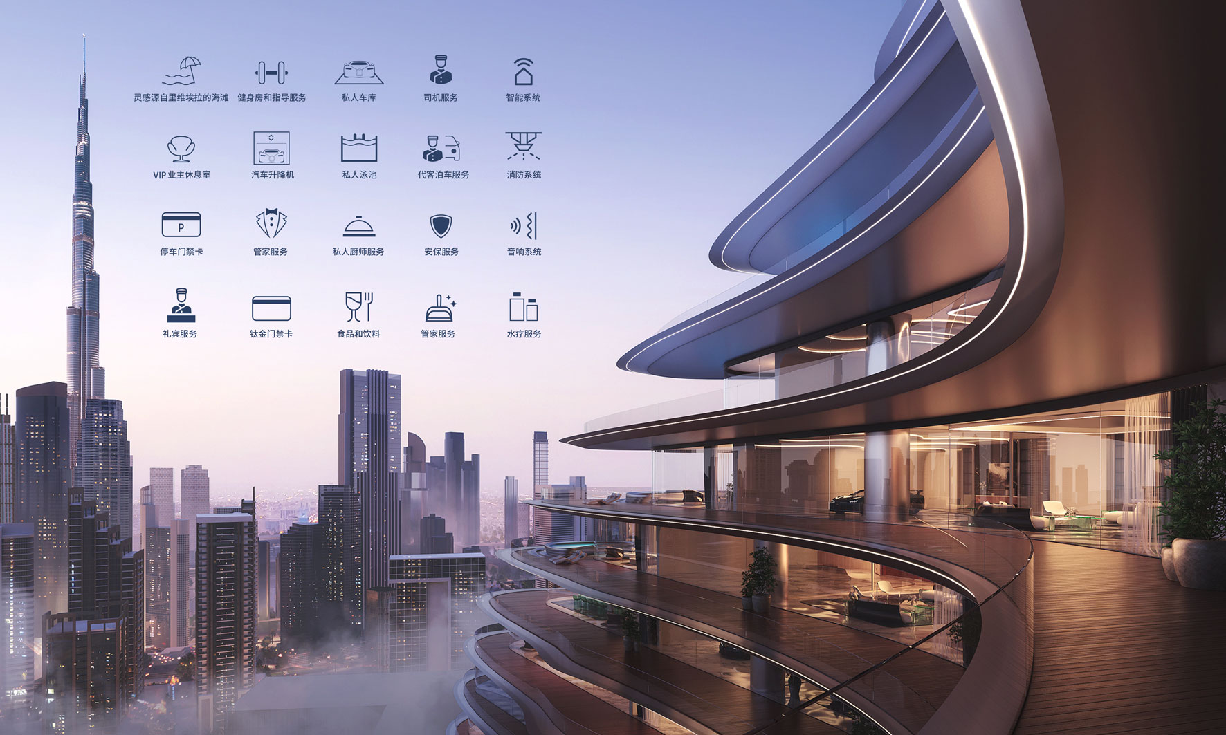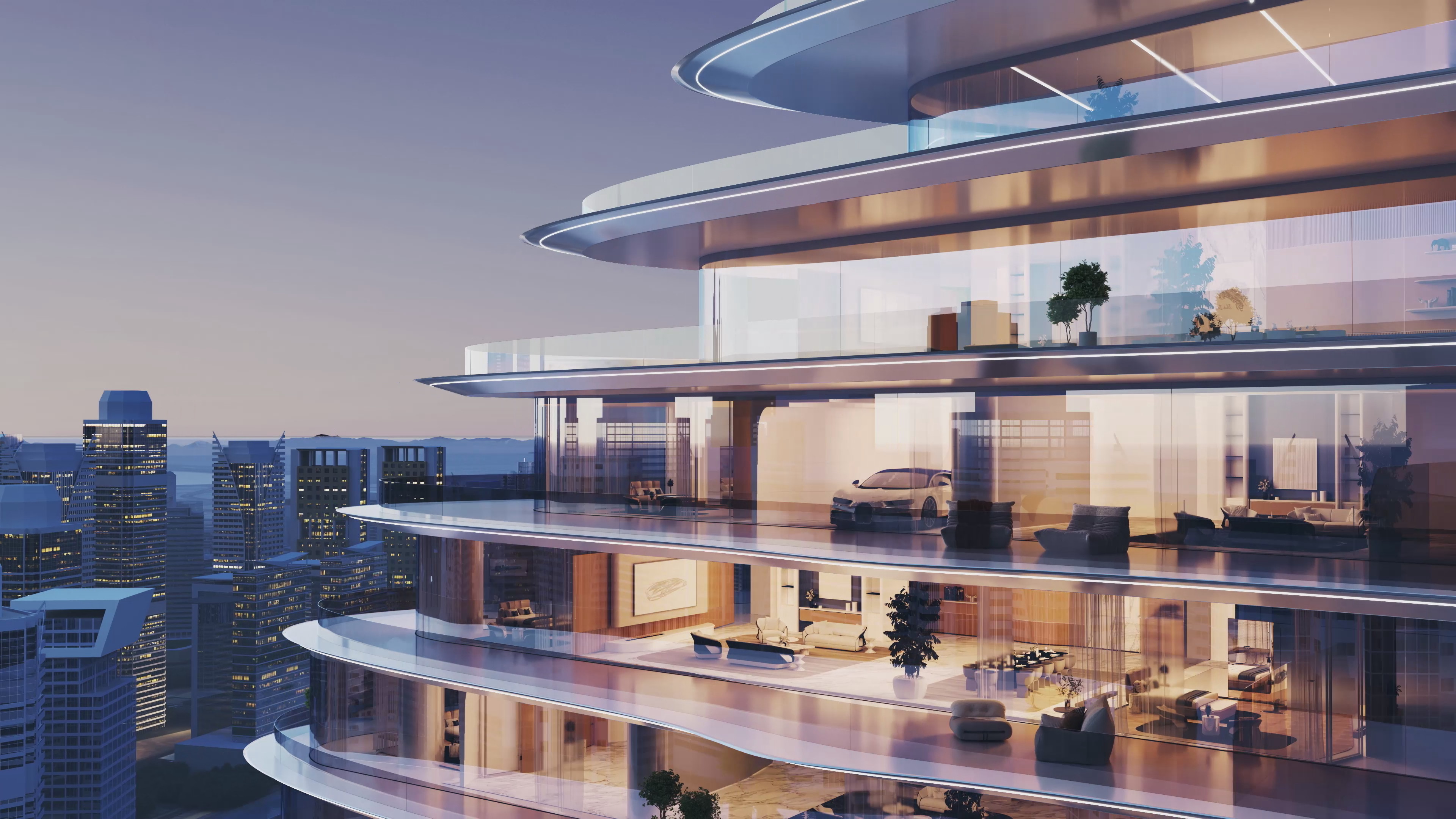 每一套单元都各具特色,独一无二。每一层都有开放式露台,现代又极富律感,宛如科幻片中的超形态大厦,与布加迪跑车的设计语言不谋而合。